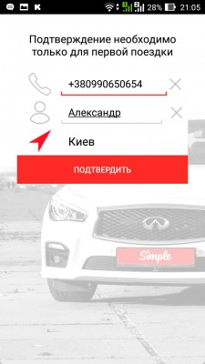 Прежде чем приступить к заказу автомобиля, нужно пройти авторизацию. Для этого необходим лишь имя и номер телефона, на который будет отправлено сообщение с кодом подтверждения. Процедура появляется только при первом запуске приложения. В дальнейшем система будет знать, как вас зовут и по какому номеру телефона можно связаться с вами.